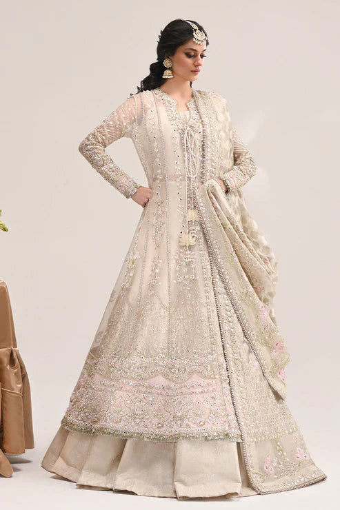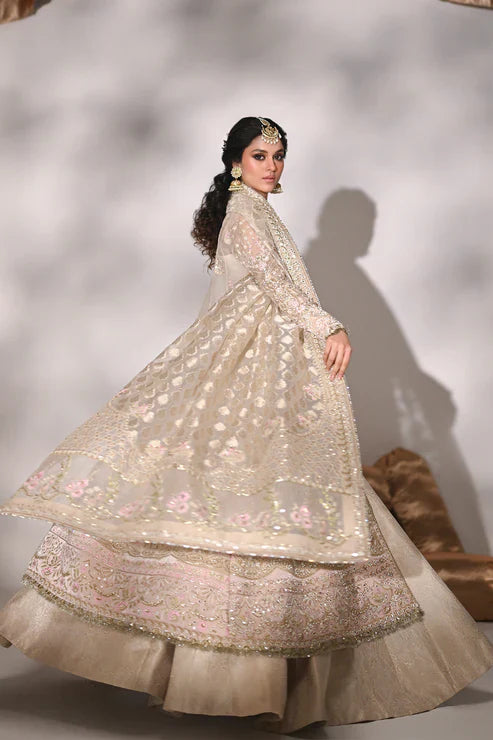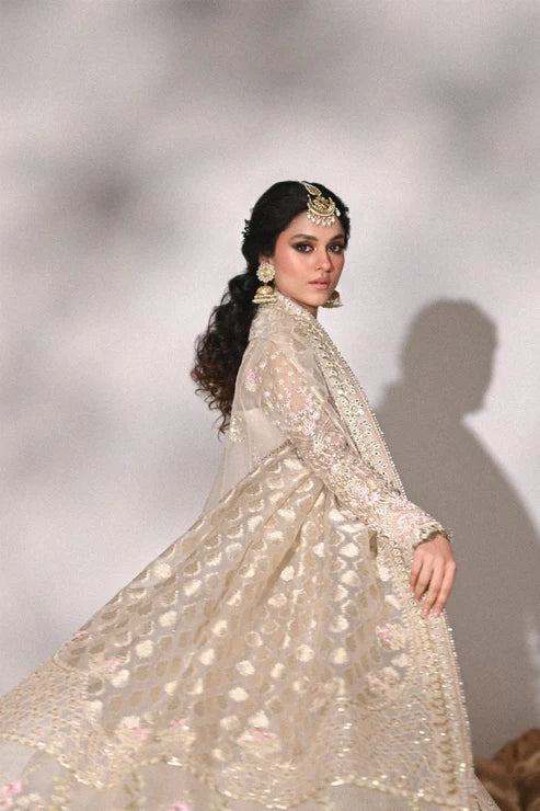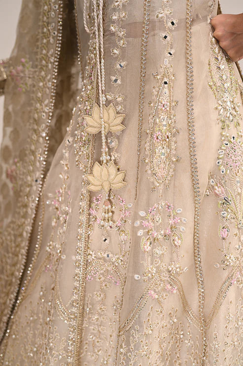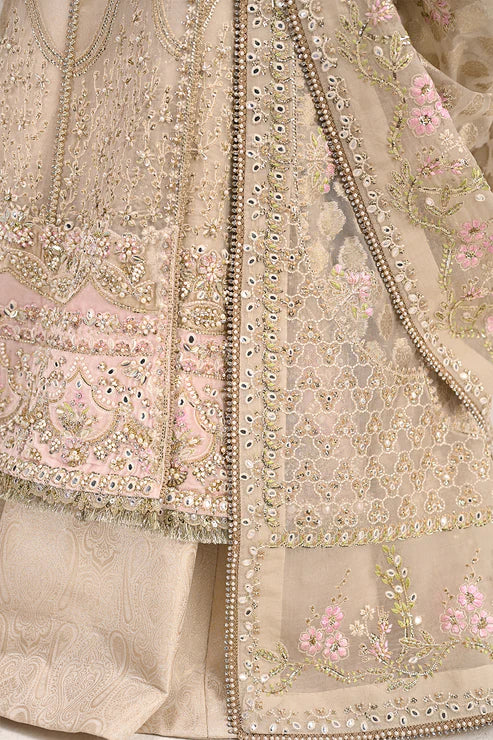 A soft beige dress adorned with intricate resham embroidery in beautiful hues, complemented by delicate hand embellishments and intricate sheesha work. This ensemble effortlessly combines timeless elegance with artisanal charm.