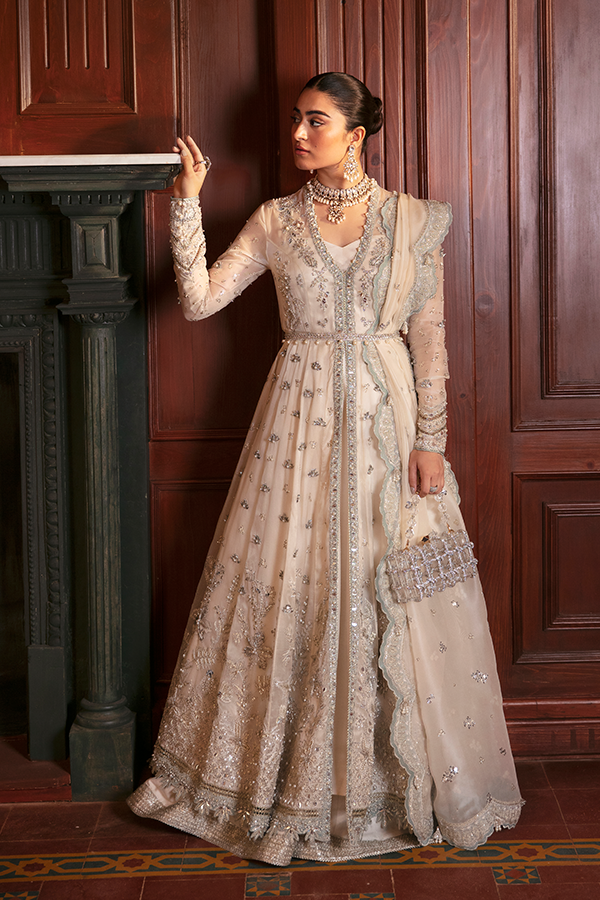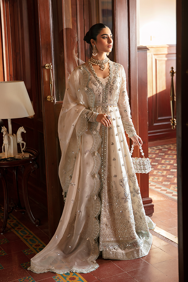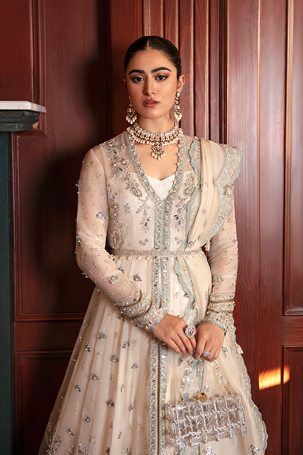 A vision of elegance and poise, the dress dazzles with its dreamy white organza peshwas shirt infused with hints of misty blue, like a fleeting reverie. Enveloping the wearer in grace, the ensemble is harmoniously completed with a same-toned raw silk shrara, draping gracefully like a flowing cascade of clouds. As a finishing touch, an organza dupatta, gracefully cascading with embroidered patched borders, bestows an air of poetic grace.