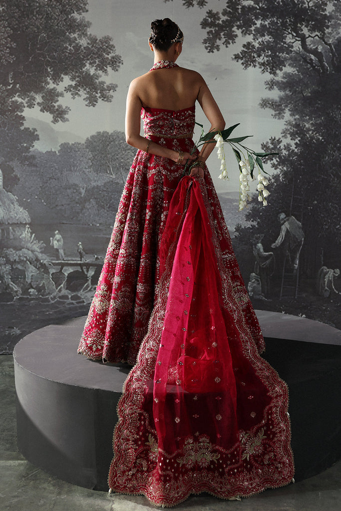 Step into the timeless charm of “Claude” a captivating deep pink lehenga choli ensemble masterfully designed with sumptuous organza fabric. The choli boasts a contemporary neckline and is adorned with a stunning array of intricate embellishments. The lehenga is brought to life with modern embroidered panels, artfully arranged with pearls, moti, tilla, dull gold sequins, and subtle accents of cut dana, creating a breathtaking display of craftsmanship. Completing the ensemble is an airy organza dupatta, featuring a broad floral border and a sprinkling of complementary-hued embroidery and sequins, making it an unforgettable choice for brides seeking a blend of tradition and modernity.
