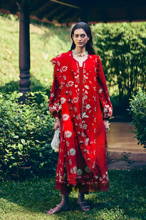 Coral Red, front-open cotton shirt featuring a square V-neckline. It is adorned with contrasting floral appliqué in organza in various shades. The shirt has lace and stitching details on the hem, and the sleeves are designed as balloon sleeves. A jaal pattern complements the side panels and sleeves, creating a cohesive look.