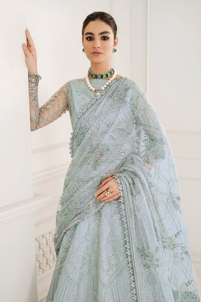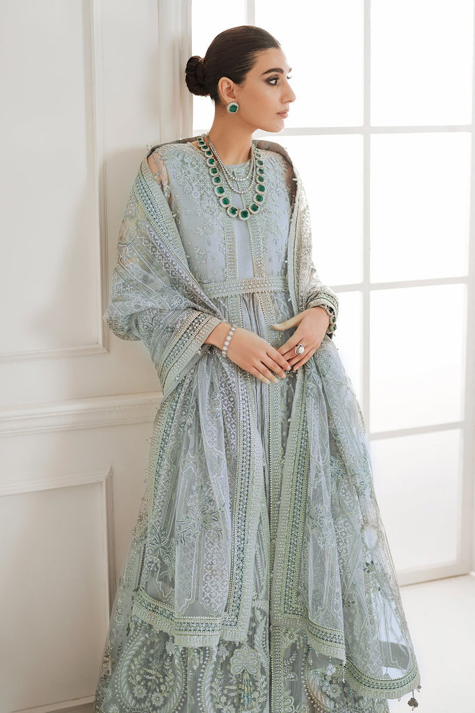 This product features a net front body with net back body, alongside net sleeves and embroidered patches on the front and back. Additionally, a net dupatta with an embroidered patch, as well as an embroidered silk trouser, complete this ensemble.