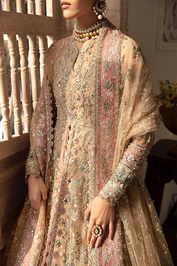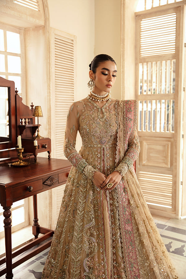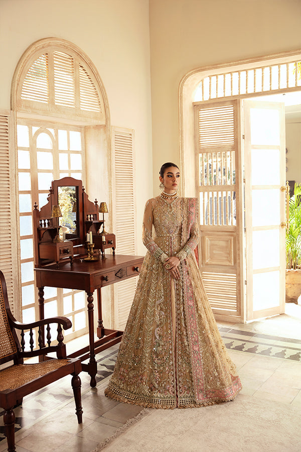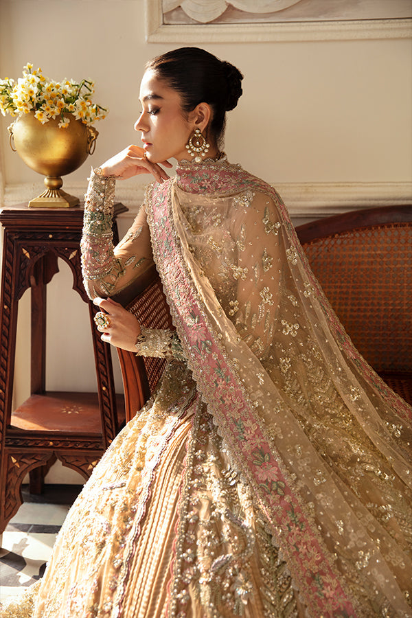 Personifying a unique feminine charm portraying lustrous silhouettes and festive mood, capturing the Dusty resplendent Gold toned Peshwas made of net and