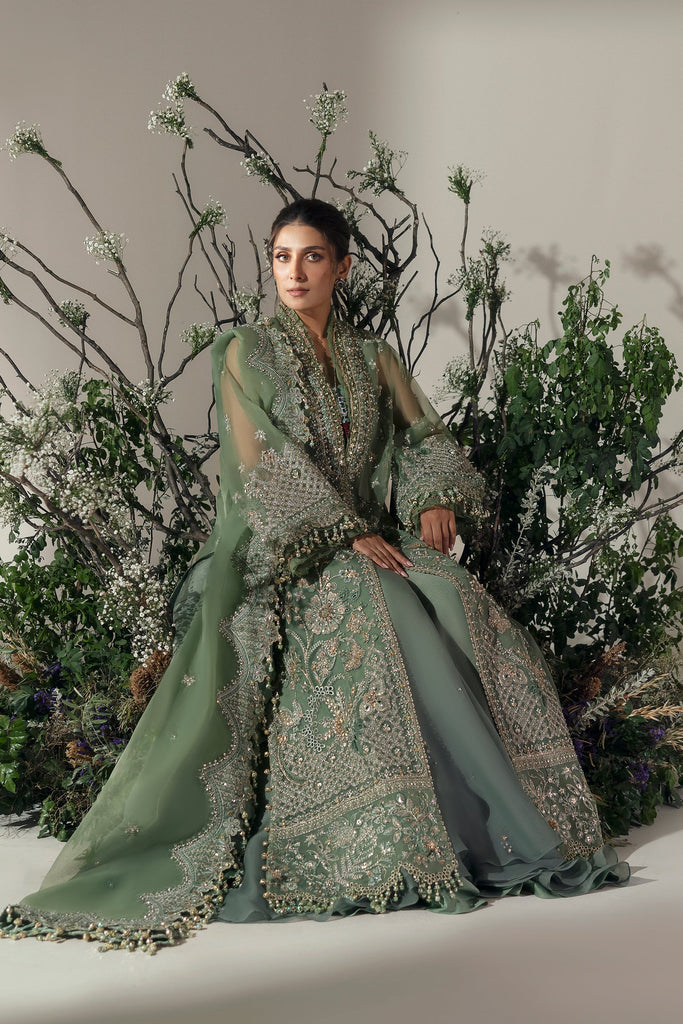 Radiant gold accents glimmer like sunlight filtering through lush palm fronds, with every detail meticulously crafted. Delicate floral vines cascade gracefully along the stole, weaving a narrative of nature's artistry.Exuding supreme elegance, ‘Twilight Teal’ is a definitive statement of sophistication, destined to leave a lasting impression at any festive occasion. Ayeza, embodying grace and allure, enchants all who behold her. Élan's artistry intertwines tradition and modernity into an enduring masterpiece, where timeless charm and luxurious allure converge effortlessly.