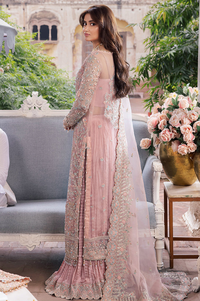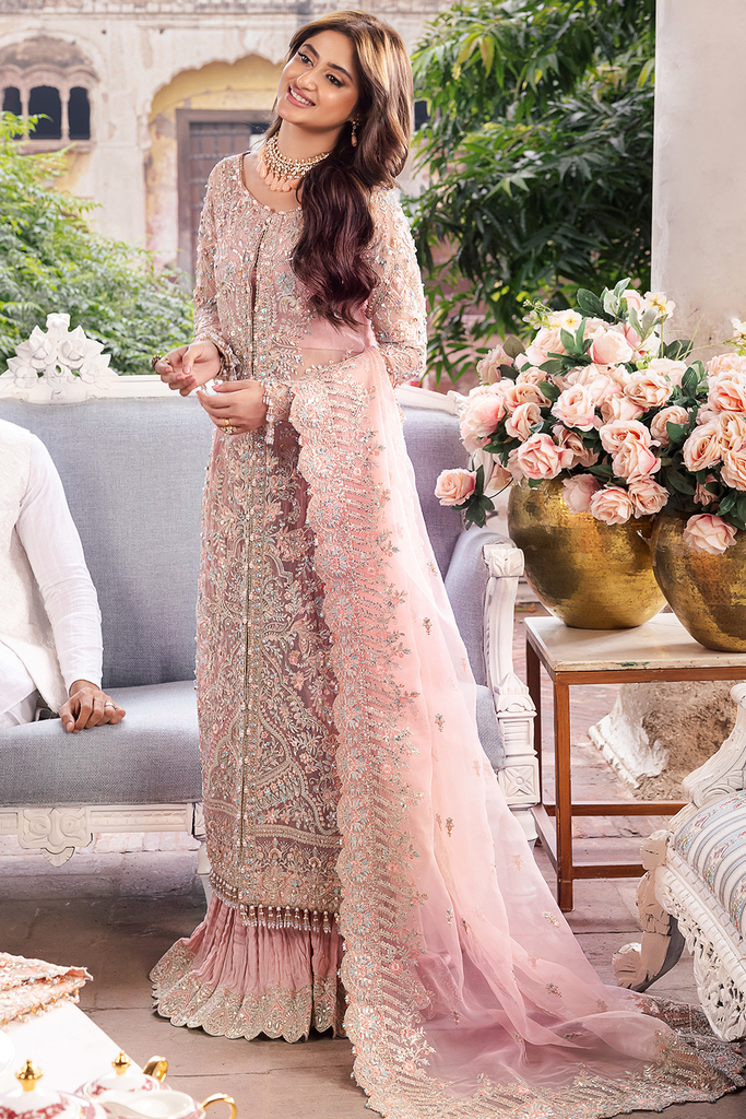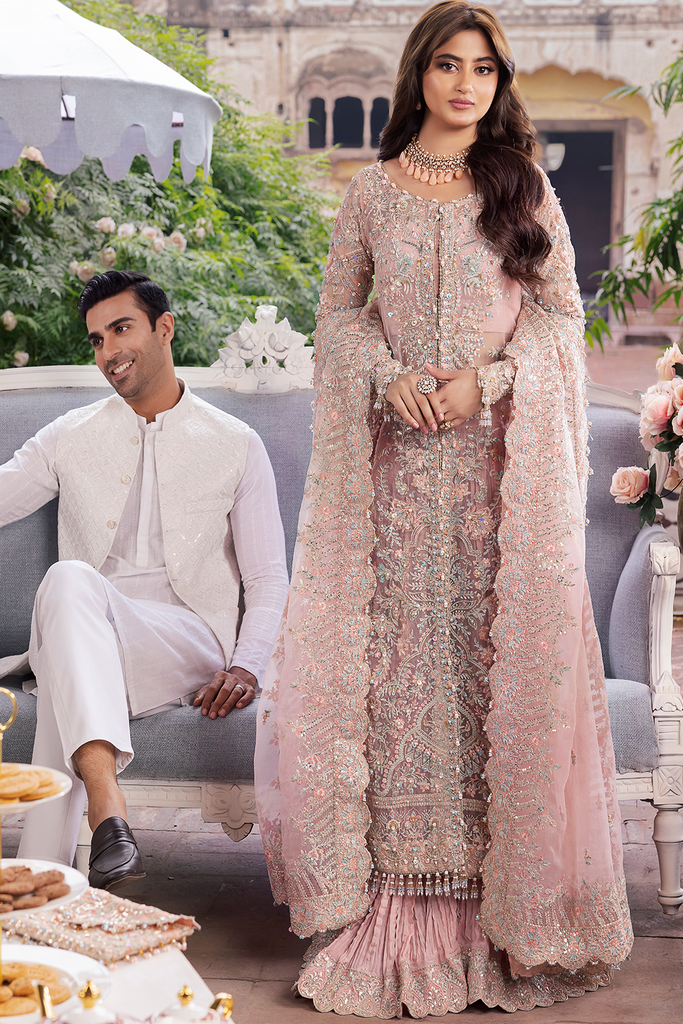 Additional Description: On a flawless light pink canvas, this artfully created piece has embroidered and embellished front. This open front shirt effortlessly captures attention. Elegantly adorned with flowery sequins and handmade accents, along with crushed sharara pants exuding luxury. This embroidered dupatta adds color and festivity, making this grand design one of our favorites in the collection.This outfit exudes grace and sophistication making heads turn. Truly a vision of timeless beauty.