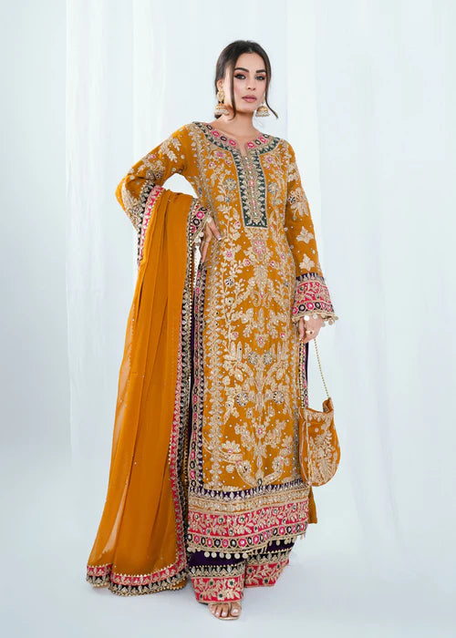 Additional Description: Meena is a four piece stitched long shirt paired with plazo pants adorned with beautiful multi coloured embroidery
