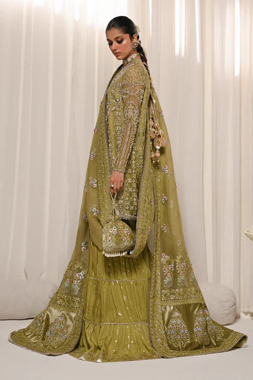An exquisite olive green ensemble featuring intricate embroidery with delicate floral motifs. Paired with a flowing sharara and a traditional Hyderabadi khara dupatta, this outfit seamlessly blends timeless elegance with regal charm, perfect for festive or bridal occasions.