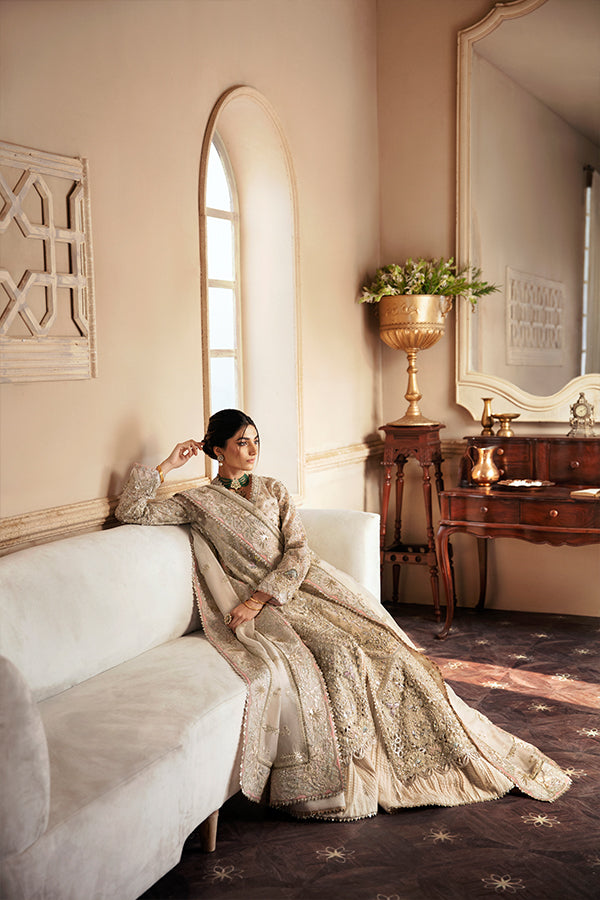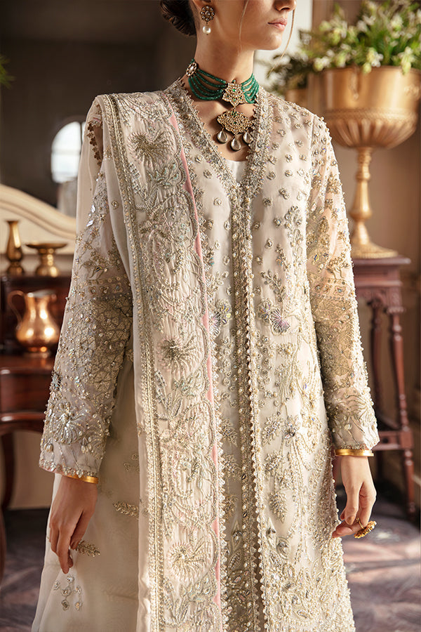A celestially splendid silhouette, this ensemble feature a detailed Ash White Organza Jacket enhanced with embellishments and cutwork. The splendid organza dupatta is accentuated with Embroidered Borders, paired with Crushed Sharara Pants, curating a stunning look and embodying an aura of subtle serenity