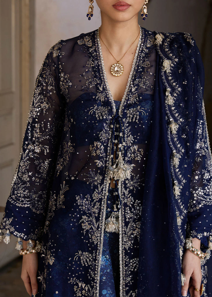 The formal embroidered organza jacket lends a luxurious and intricate touch. The trousers are made of Korean-printed raw silk sharara, adding a touch of elegance and uniqueness. To complete the ensemble, the sequin-embroidered borders on the dupatta provide a beautiful finishing touch. This outfit is a true statement piece.