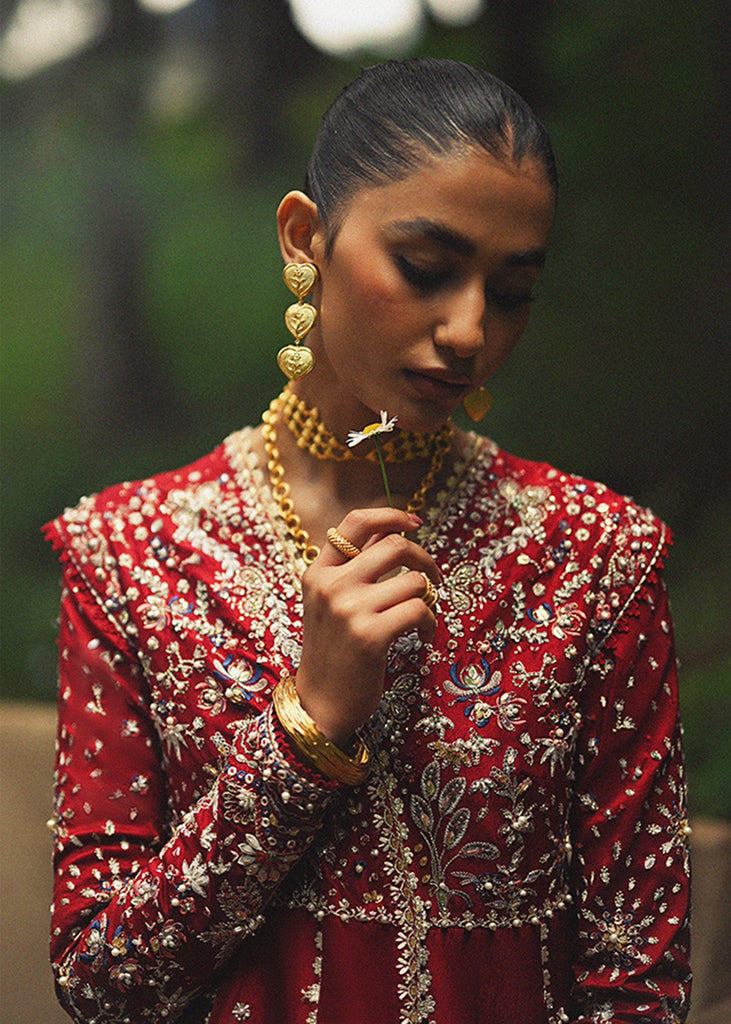 - Ruby red raw silk Front open pishwas with a V neckline and heavy embroidery all over and on border and handwork of pearls and precious stones comes with Fitted sleeves.