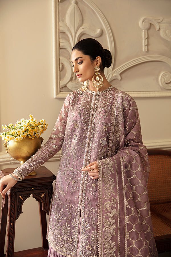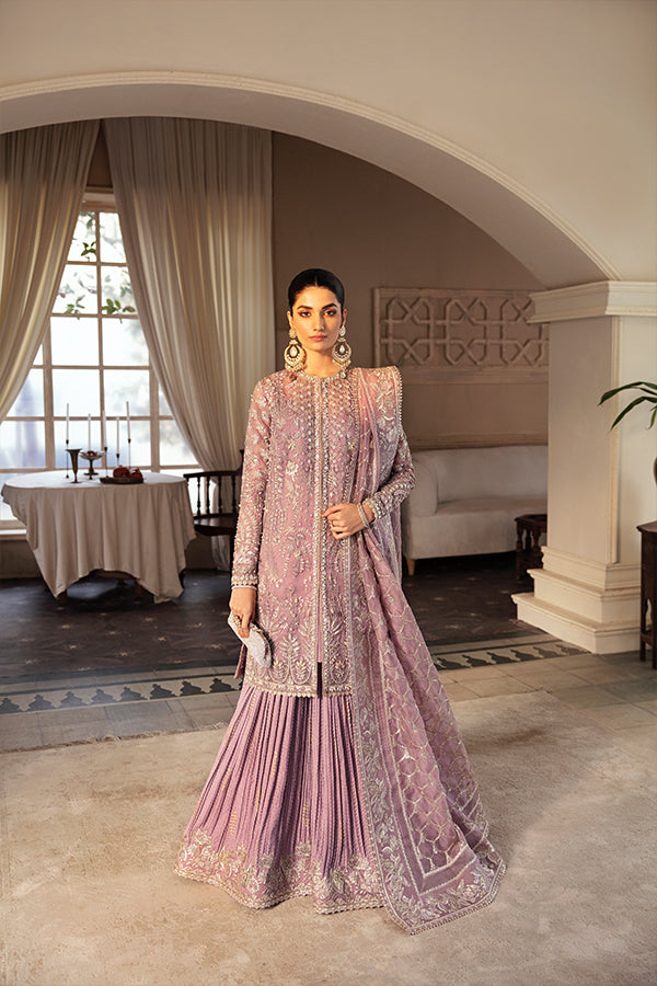 A perfect embodiment of celebration, ‘Sehr’ a graceful ensemble, featuring the timeless charm of dusty mauve. This lavishly adorned Organza Jacket and airy drape dupatta with enchanting screen print, is skillfully adorned with intricate hand embellishments work, pairied with a Crushed Sharara, adding a touch of traditional work.
