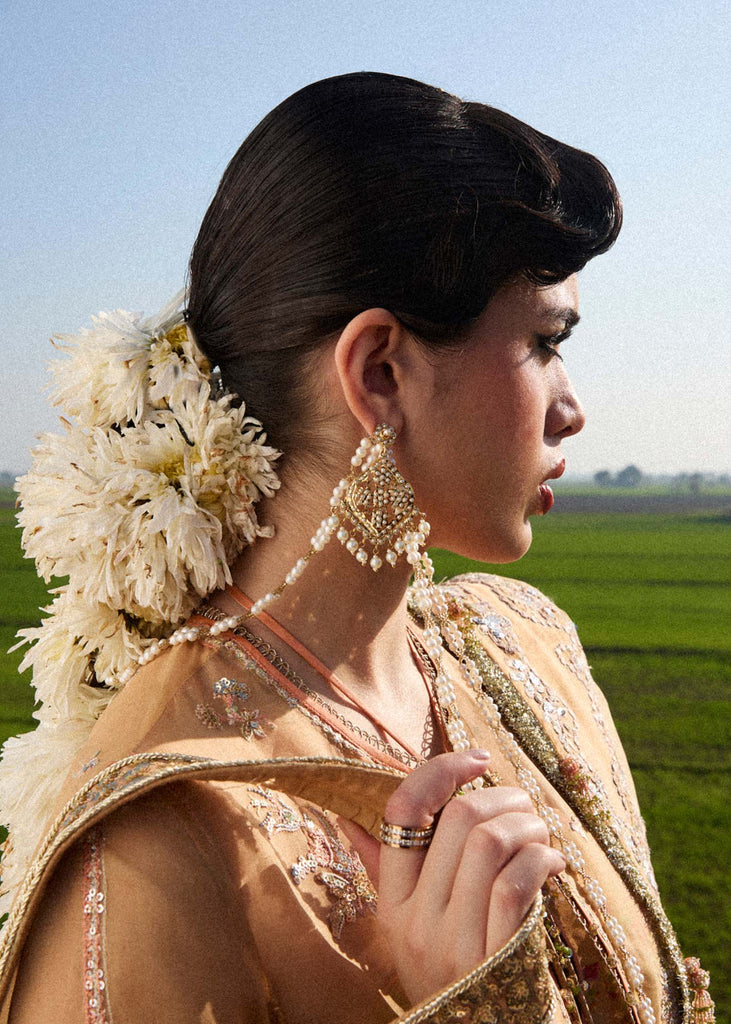 The organza jacket, composed of intricate sequin embroidery, is paired with a Korean raw-silk printed inner, creating a beautiful amalgamation of fabrics. The Korean raw-silk sharara, adorned with sequins embroidery, adds a touch of elegance. Heavy embroidered organza dupatta borders add a glamorous touch to the overall attire. This outfit is both elegant and beautiful, making you feel like a true fashion icon.